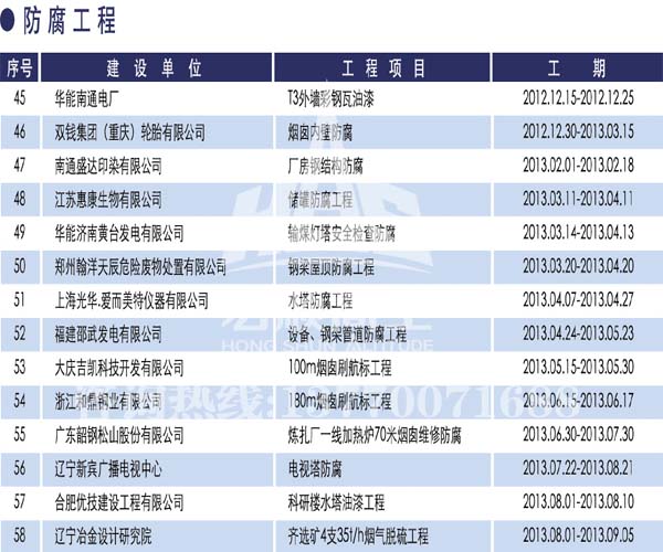 宏順建設(shè)工程有限公司是國家批準成立的專業(yè)高空作業(yè)企業(yè):承攬過(國內(nèi).國外)煙囪新建、煙囪防腐、吊機防腐、水塔防腐、管道防腐、龍門吊防腐、儲存罐防腐、煙囪內(nèi)壁防腐等高空作業(yè)工程。具有“不搭腳手架 、 不需要停產(chǎn)”施工特點。